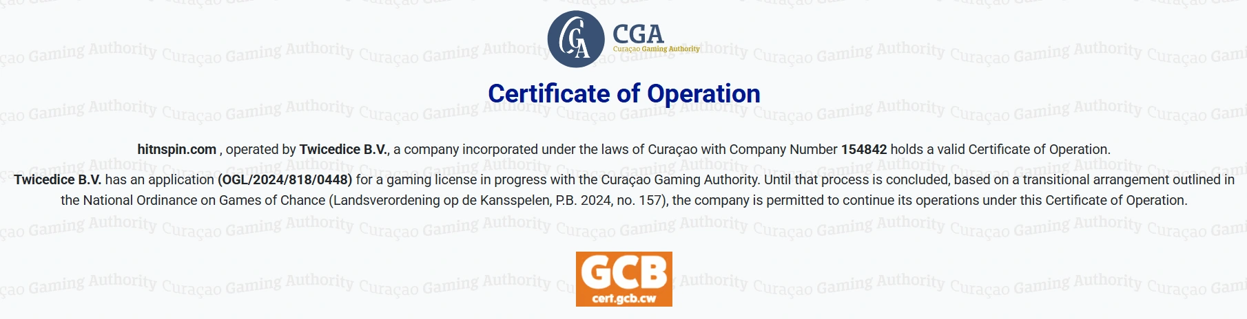 HitnSpin operiert mit einer offiziellen Lizenz von Curaçao eGaming (Lizenznummer 8048/JAZ2021-047). Als relativ junges Casino, gegründet 2023, hat sich HitnSpin bisher einen soliden Ruf in der Online-Glücksspielbranche aufgebaut.