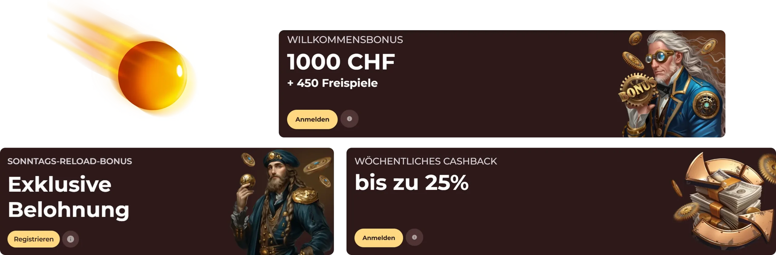 | Willkommensbonus | Bis zu 1’000 CHF + 450 Freispiele |