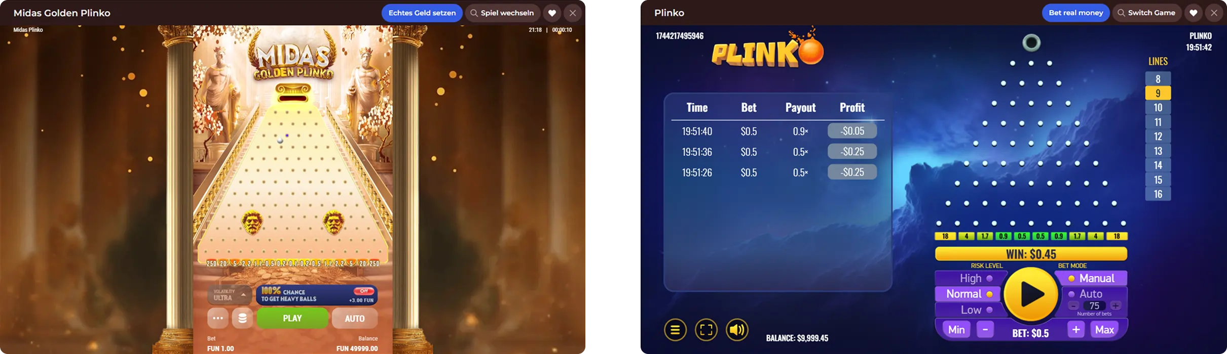 | Plinko | Spribe | 97.0% | x555 | Farbige Kugeln je nach Risiko-Level |