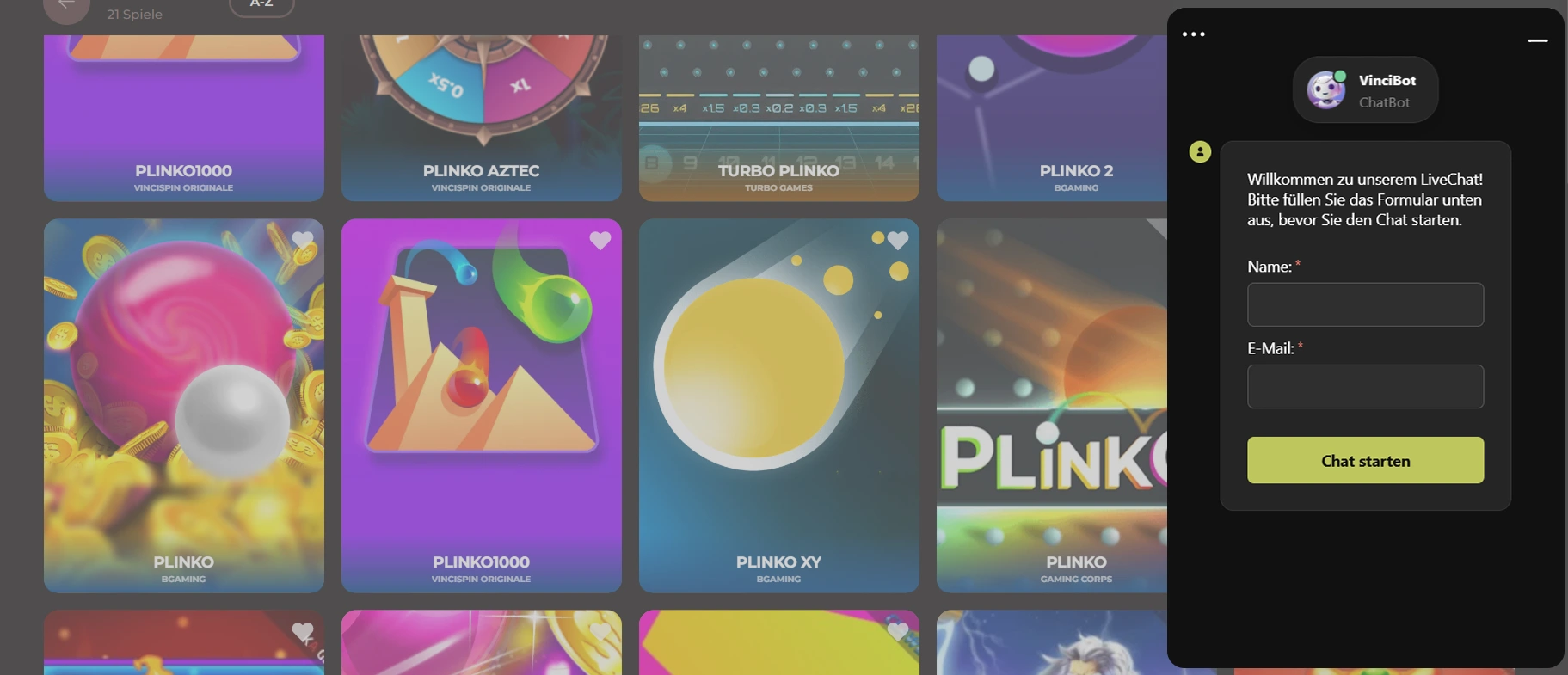 Die Boni und Aktionen bei VinciSpin können auch für Plinko-Spiele genutzt werden – ein wichtiger Vorteil gegenüber manchen Konkurrenten, die Tischspiele und Spezialspiele häufig von Bonusangeboten ausschliessen.