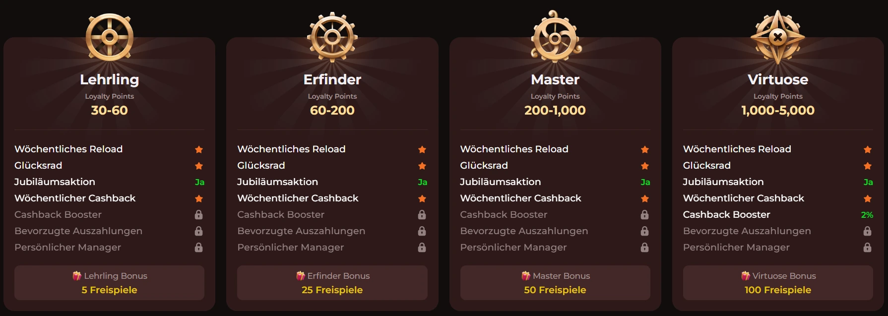 Das VIP-Programm von VinciSpin bietet ein klar strukturiertes Stufensystem, das regelmässigen Plinko-Spielern erhebliche Vorteile bringen kann. Die sieben Loyalty-Stufen reichen von Anfänger über Lehrling, Erfinder, Master, Virtuose und Genie bis hin zur höchsten Kategorie Vinci Legend.